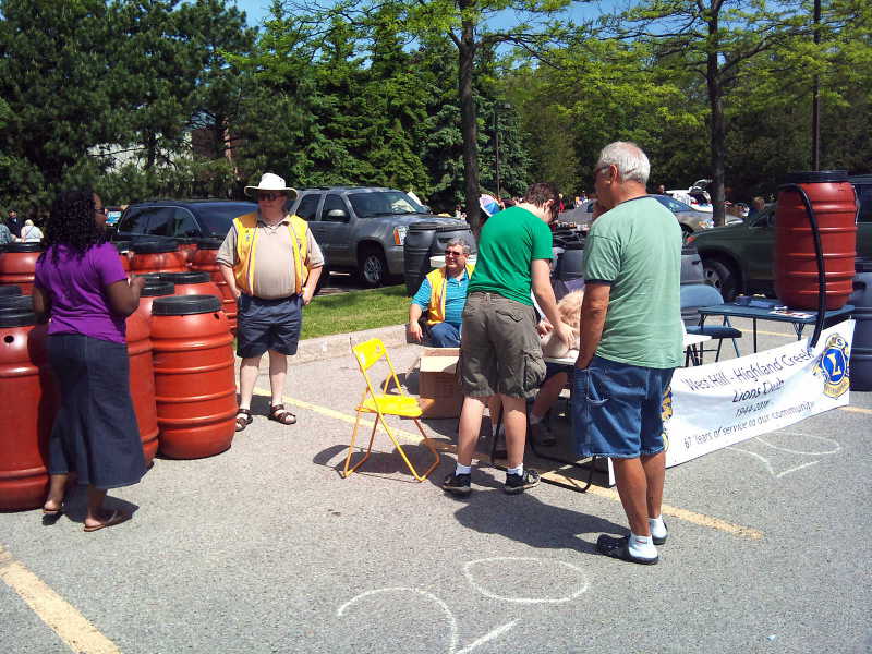 The West Hill - Highland Creek Lions partnered with Toronto City Councillor Glen DeBaeremaeker to sell rain barrels at a series of community compost give-aways he arranged. While the Lions ran out of rain barrels early on in the sale, they continued to take orders for later pickup.