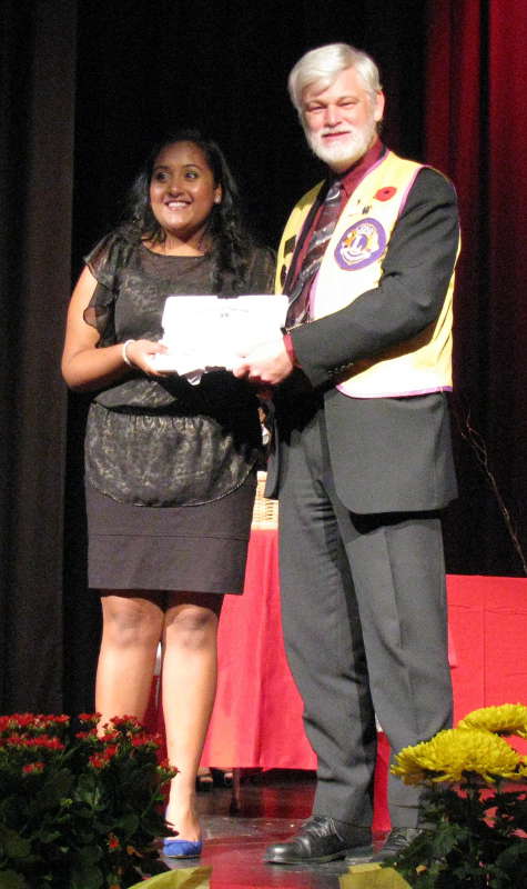 The West Hill - Highland Creek Lions Club presented its annual Community Service Award to graduating students at Sir Oliver Mowat CI and West Hill CI. Pictured is Lion Gary presenting the award, worth $300, to Devina Persaud at West Hill CI. Lion President Paul presented a similar award to Kajaniya Kajendran at Sir Oliver Mowat CI.