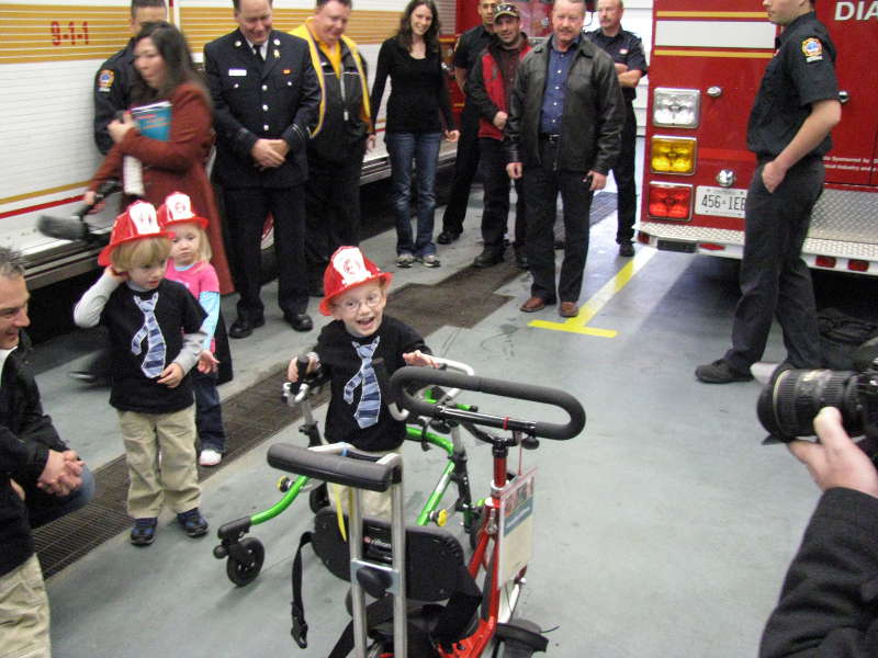 The West Hill - Highland Creek Lions teamed up with the Toronto Firefighters Association to give 3 year old Zachary Raymant, who suffers from Cerebral Palsy, a new bicycle. The special bicycle includes straps and adjustments to keep him safe but mobile. He and his brothers and sisters also got a tour of the fire station.